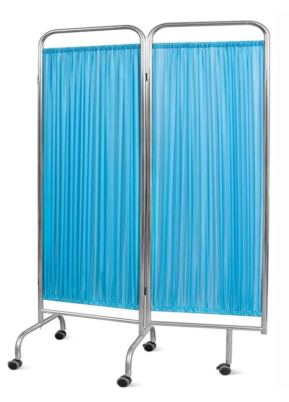 Dwuskrzydłowy parawan lekarski ze stali kwasoodpornej. Trwała i higieniczna przegroda medyczna do gabinetów i szpitali. Elastyczna konstrukcja, łatwy w czyszczeniu.